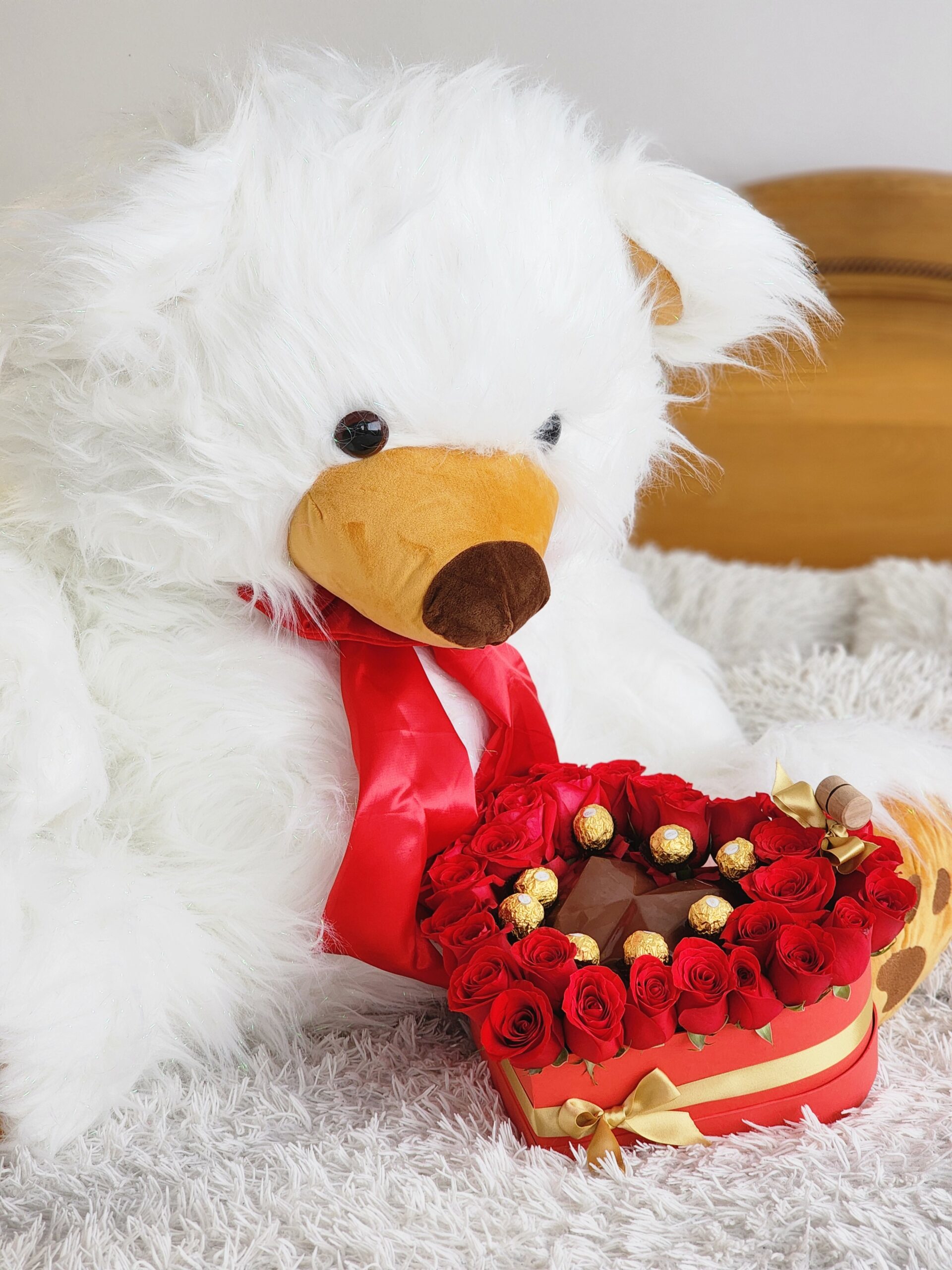 Sorprende de una forma inolvidable con nuestro oso de peluche grande con rosas rojas, chocolates y corazón de chocolate relleno, el regalo romántico perfecto en Bogotá para enamorar y emocionar.